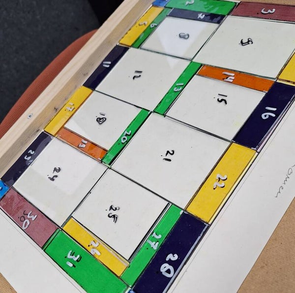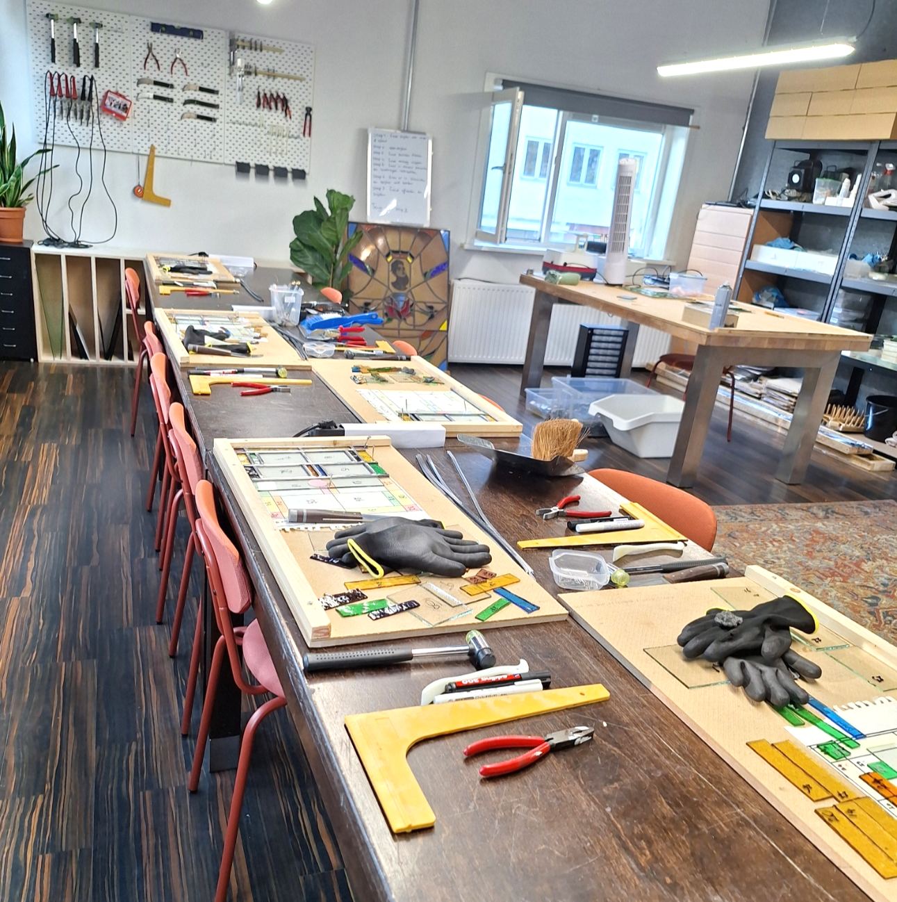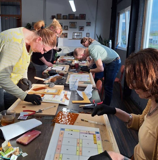 - De grote workshop bestaat uit: een schaaltekening maken, glas snijden, glas in lood zetten, solderen en kitten.
