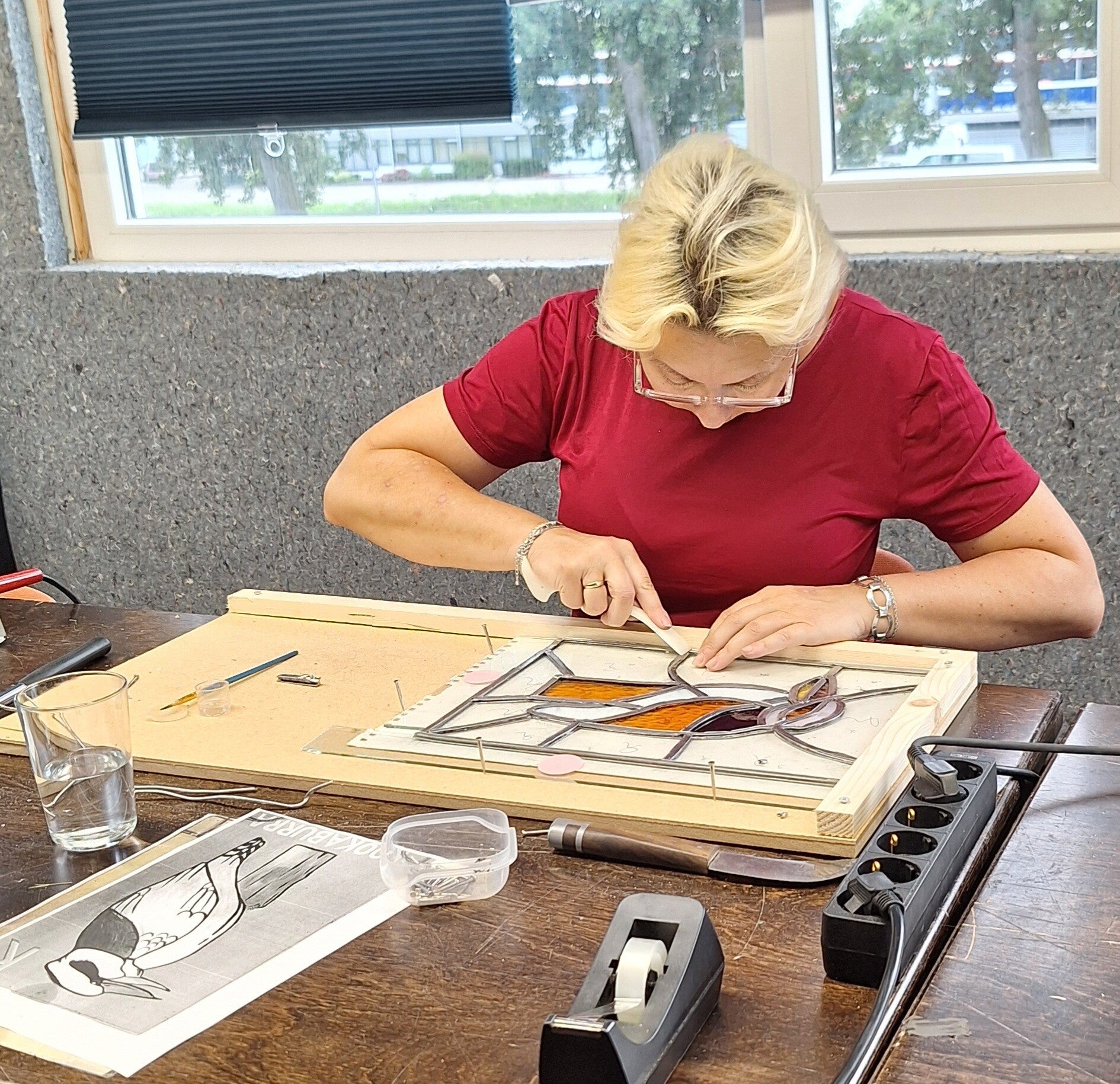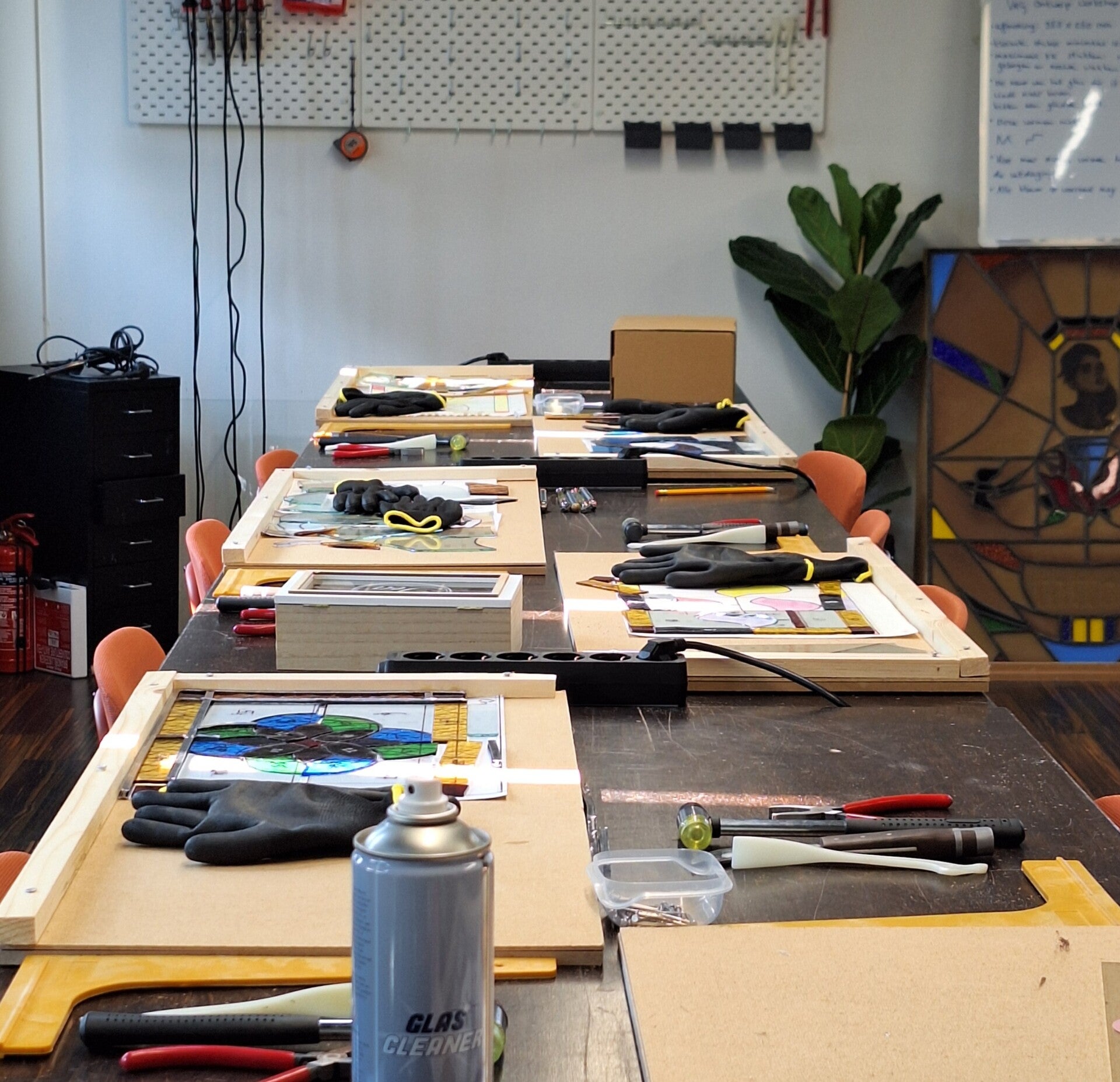 - De grote workshop bestaat uit: een schaaltekening maken, glas snijden, glas in lood zetten, solderen en kitten.