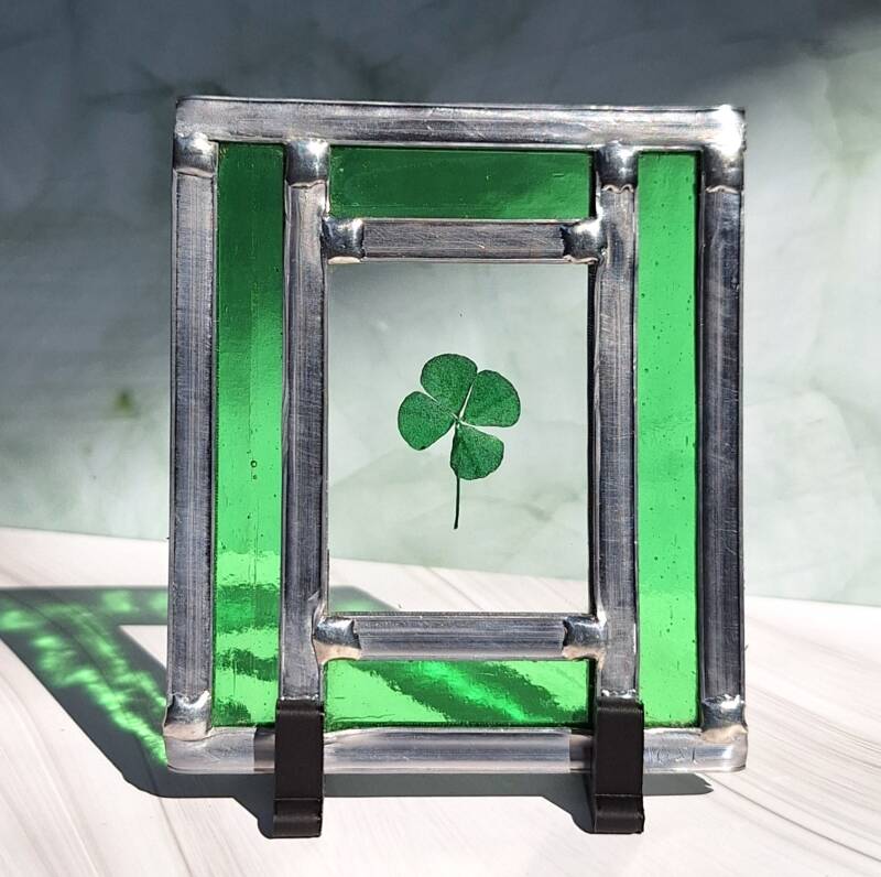 Verras je dierbaren met een bijzonder en handgemaakt glas-in-lood kunstwerk, ingelijst met een echt uniek klavertje vier.