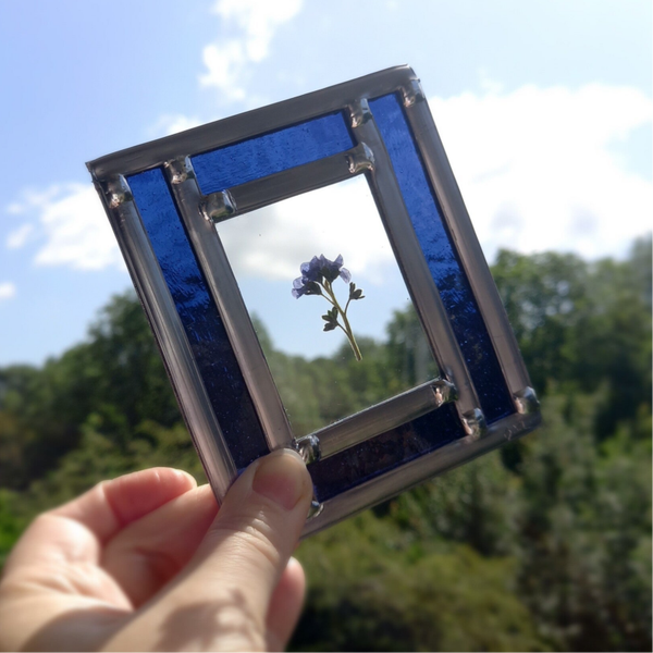 Geef je geliefden een handgemaakt glas in lood kunstwerkje ingelijst met een (let op: uniek) Vergeet me nietje cadeau.